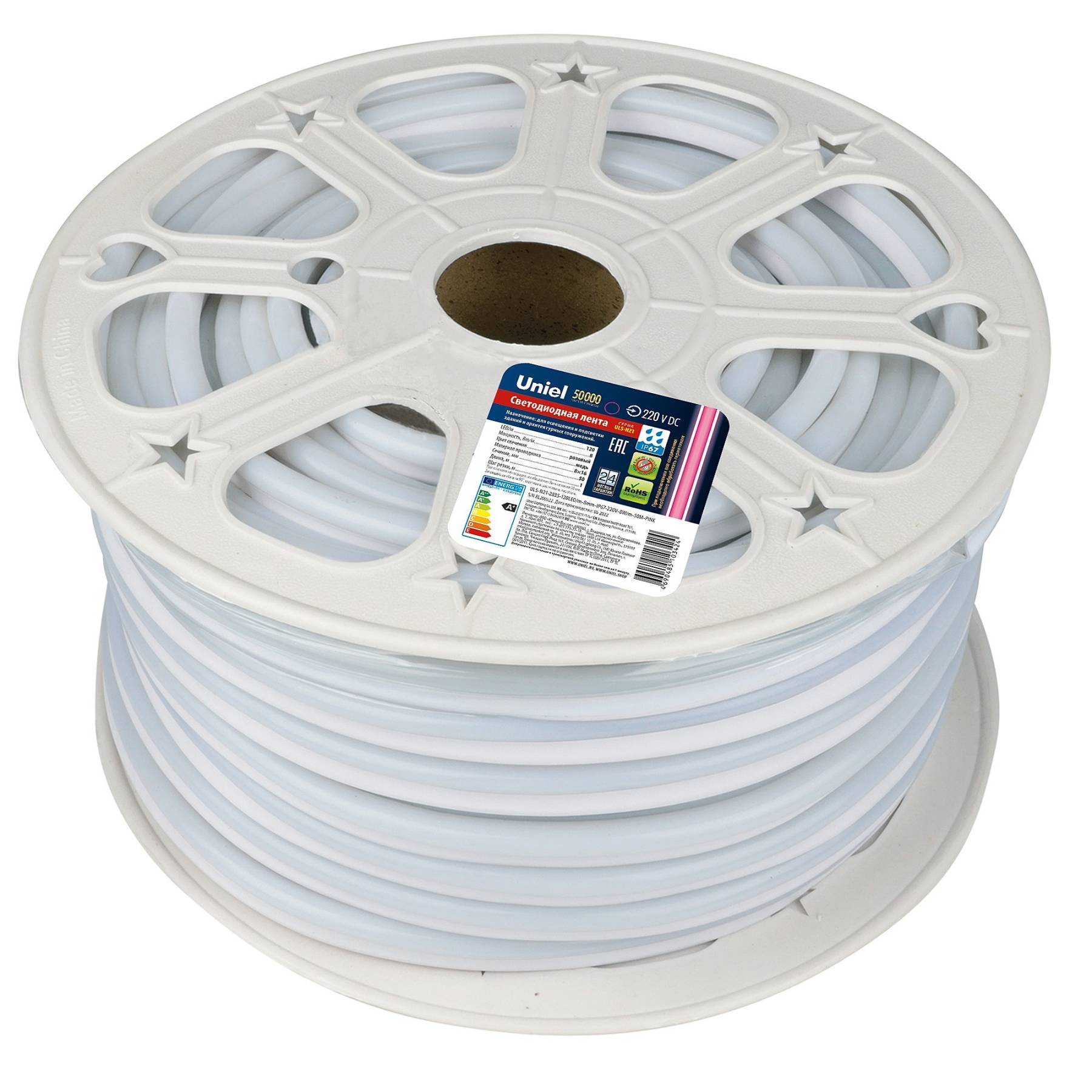 Светодиодный шнур Uniel ULS-N21-2835-120LED/m-8mm-IP67-220V-8W/m-50M-PINK бобина