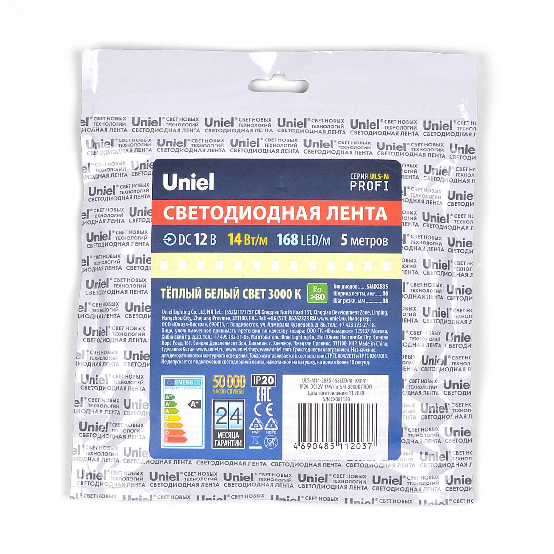 LED лента Uniel ULS-M14-2835-168LED/m-10mm-IP20-DC12V-14W/m-5M-3000K PROFI катушка в герметичной упаковке